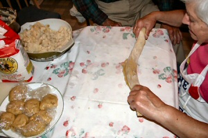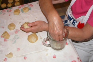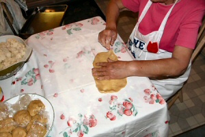 The dough that was rolled into balls, oiled, wrapped and set aside is now ready for use! The dough ball is unwrapped and place on a cloth surface (and old cotton tablecloth is preferable). The dough is then smacked several times with the palm of the hand.
