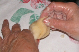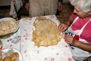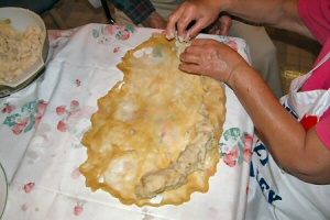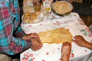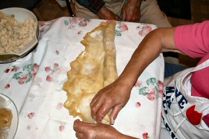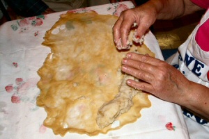15. Spread an old table cloth on work surface. Sprinkle with flour. Unwrap a dough ball and pound on cloth until flattened. Stretch dough, starting at the center, into a long oblong shape.