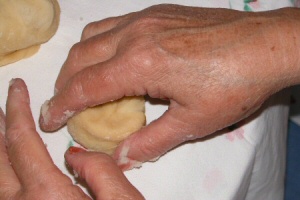 21. With the left hand, squeeze around the roll about 2" from the right end until you've pinched off a 2" section (if left-handed, reverse this step).